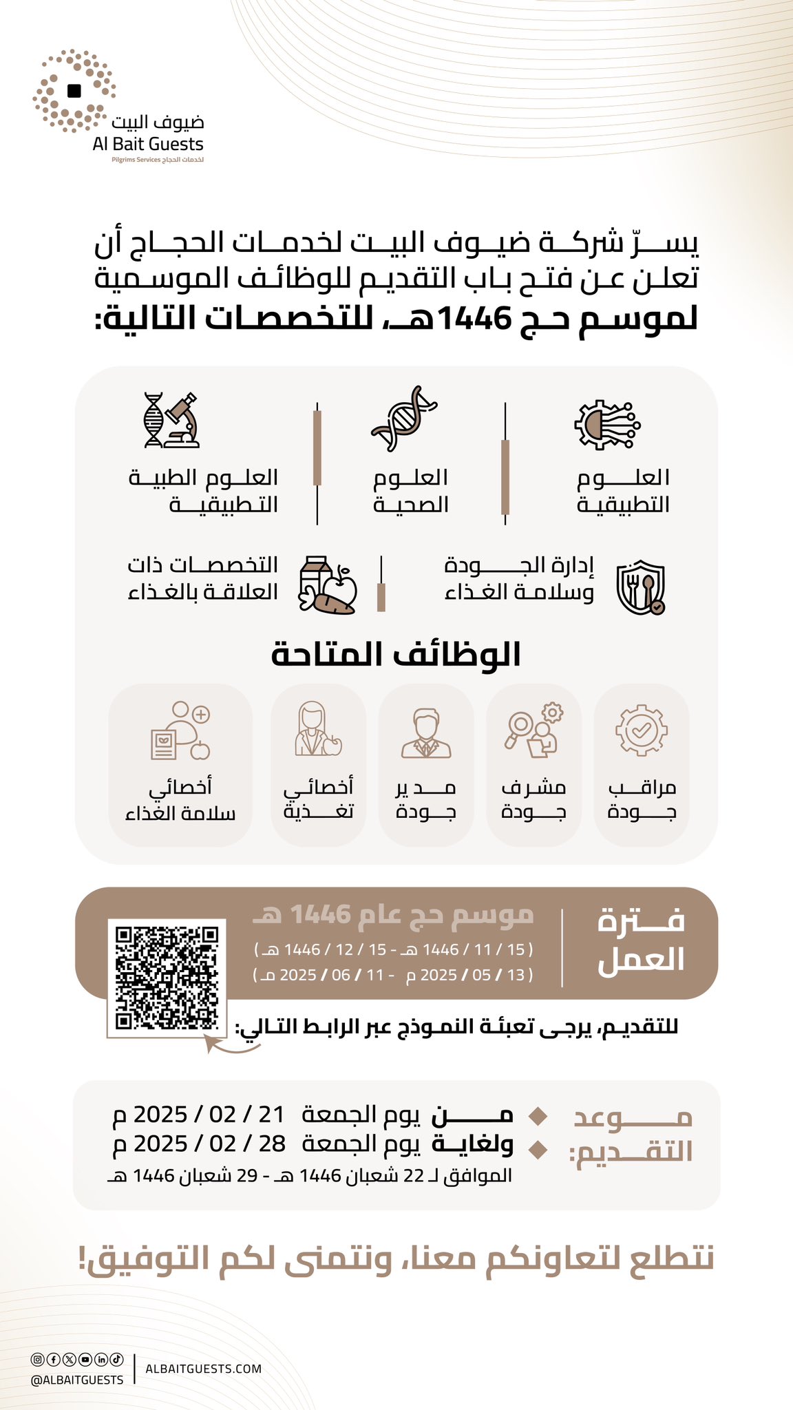تعلن (شركة ضيوف البيت) عبر حسابها الرسمي (تويتر) عن فتح باب التقديم للوظائف الموسمية لموسم حج 1446هـ، وذلك وفقاً للتفاصيل والشروط الآتية.